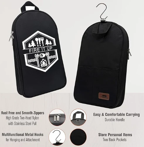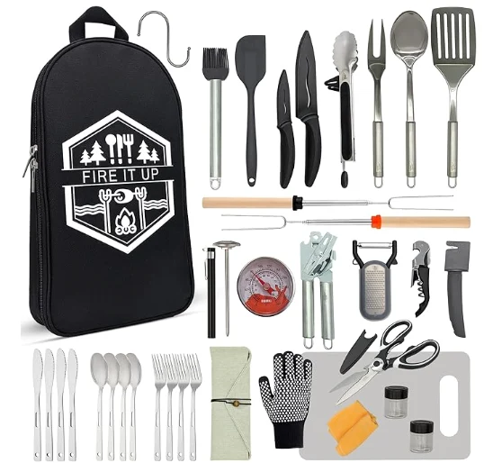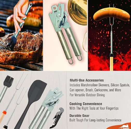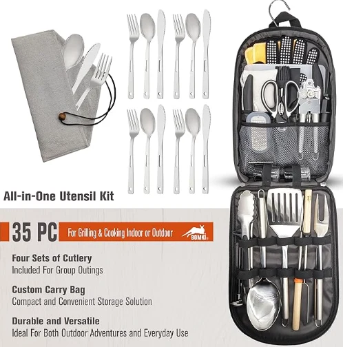 Mála stórála cócaireachta campála amuigh faoin aer Is réiteach iomlán é an 35 uirlis chócaireachta campála seo do do riachtanais chócaireachta lasmuigh. Cuimsíonn sé tacar cócaireachta cistine campála agus tacar cócaireachta campála, iad uile pacáilte go néata i mála saincheaptha le hurranna breise agus dhá phóca ar ais. Tá an tacar deartha chun freastal ar do chuid buneilimintí cócaireachta campála go léir, rud a chiallaíonn go bhfuil sé fíor -riachtanach le do ghiar campála