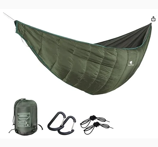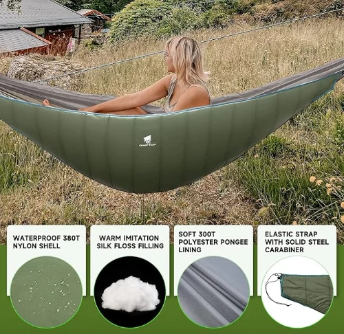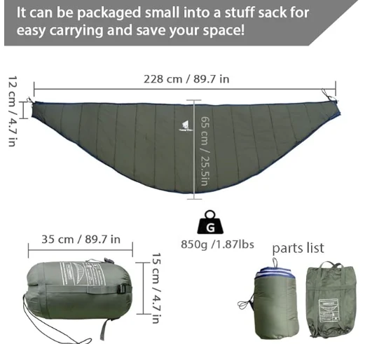 Tá an chuilt 3 -4 séasúir hammock oiriúnach do theochtaí ó 41 ° F go 68 ° F; Tá sé múnlaithe go breá le hamóg a chrochadh, a sciathann tú ón ngaoth agus a choinníonn tú go grinn.