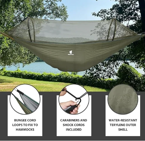 Taisteal Camping Hammock, comhcheanglaíonn compord mála codlata agus inslithe hammock, é a dhéanamh níos éasca le haon hammock méid caighdeánach a choinneáil, ag coinneáil te i aimsir fhuar. Tá sé foirfe le haghaidh campála, cúltaca, fiach, gníomhaíochtaí lasmuigh, sléibhteoireacht